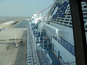 Next phase of the Ozbus trip! We all left the King’s Joy Hotel in Beijing, laden with our original bags and backpacks and with a few more if we’d bought a lot along the way. We made good time to the sea terminal and said goodbye to Pete and Gary who’d come to see us off. After that it was a bit of a wait till we could check in and embark. Those who did the online check-in didn’t get through any quicker than those of us who didn’t bother! And then we were on a glass covered plank onto the ship (at a great height so I kept my eyes on the head in front). What a massive boat! Our cabin is not bad, fairly roomy – until you squeeze four people in and lower the two upper bunks. But a great wardrobe and bathroom area. We were directed to the foodcourt on Deck 14 – so up we went and I got the best salad since somewhere in Europe. This promises to be a nice break from the trip so far!
