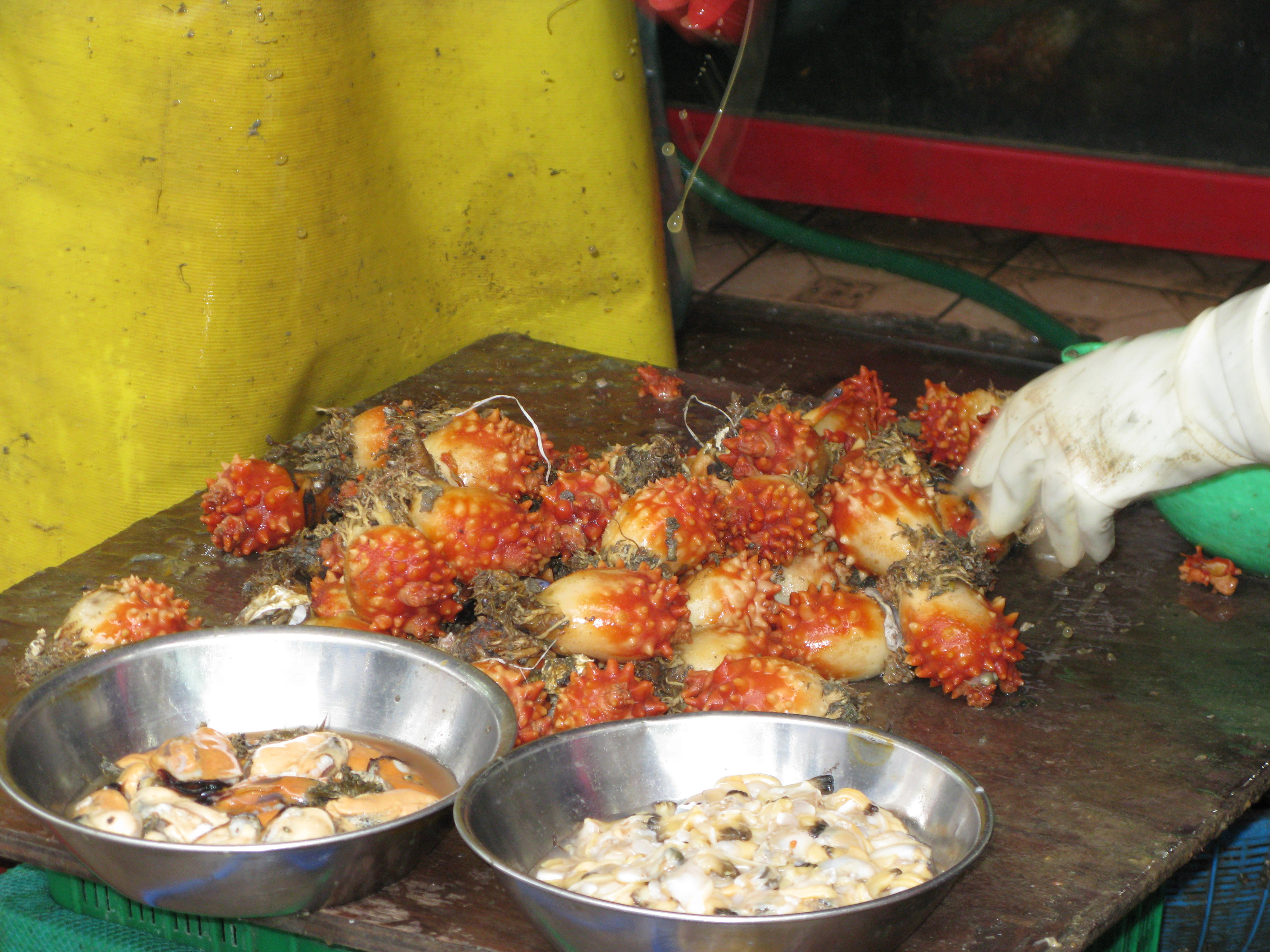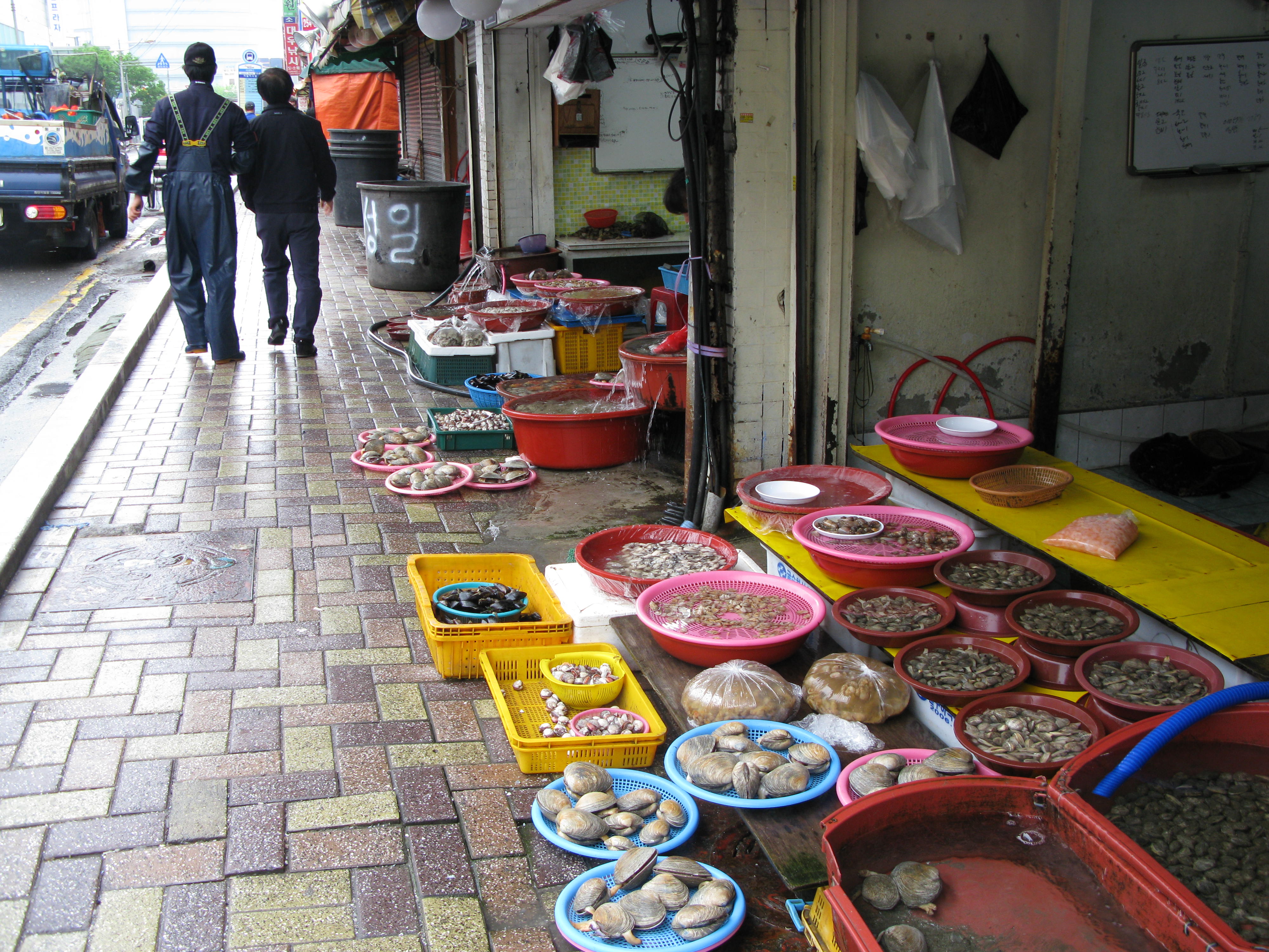 Apparently Busan was the scene of massive fighting in about 1953 – but you’d never know it now. It’s a busy, thriving city, stretching for miles along the coast and bordered inland by mountains that look picturesque from all angles. Four of us took the shuttle bus from the ship to the Phoenix Hotel, our drop off point downtown. We had a student doing his first day as guide on the bus; he had a little trouble pronouncing certain words and raised a laugh with his ‘Penis Hotel’. Pat C, being more charitable than the rest of us, took him aside for a quiet word to ensure he didn’t spend the rest of the day as a figure of hilarity amongst shuttle customers. She felt he didn’t know what ‘penis’ meant anyway, so no harm would have been done. And more people would have been able to report this in their blogs…. Anyway, we were deposited outside the hotel, paid a quick visit to Starbucks to get water, visited a beauty shop with a beautiful shop assistant to get more wet wipes (staples on a trip like this!)then looked for the local city tour bus we’d seen advertised. With half an hour to kill, we explored the area around the fish market – some seriously strange fish here. Some of them looked really unappetising, almost poisonous. Surely you’re not meant to eat bulbous orange fish with blue tinged spikes? Doesn’t nature make them like that to warn you off?