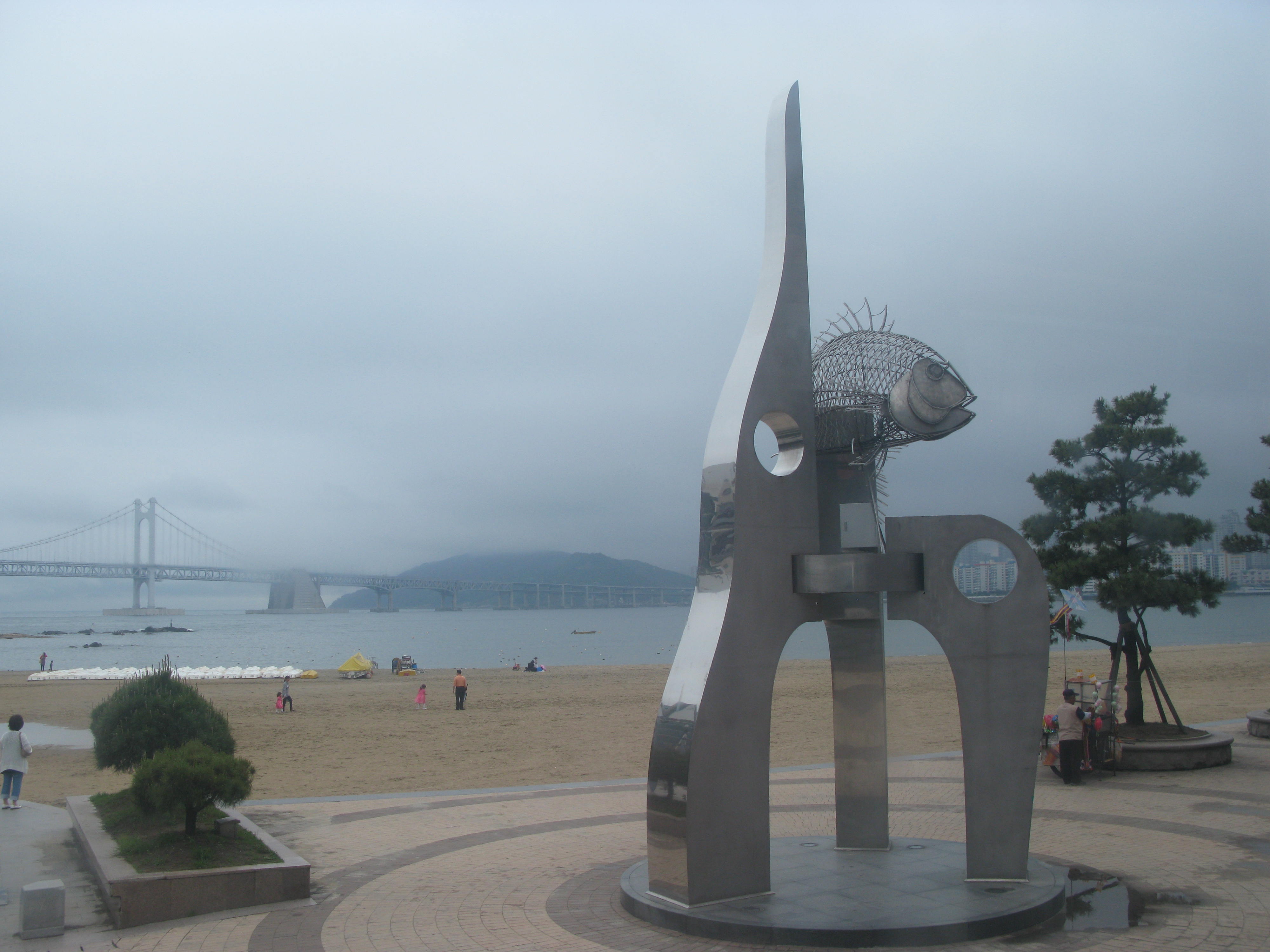 Busan is a beautiful city and the tour we were on – more than 1.5 hours – took us through the main city and out to Gwangalli Beach which you can see in the top picture (reminded me bizarrely of Bondi Beach…same shops and cafes..) and further on to Haeundae Beach, full of luxury hotels and apartments and expensive boats. Everything was so clean and attractive – if the exchange rate were favourable it would be a great place to live, or spend a few months of each year. I’m thinking about it. We returned to the city via the amazing Gwangan Bridge, which just floats across the bay in an ethereal sort of way, in the mist which descended from the mountains now and again. Apparently at night it is magical, with over 100,000 lights twinkling along its length. Finally, before reaching the bus station and getting a taxi back to the International Cruise Terminal, we passed the city Arboretum and the UN Memorial Cemetery, where there are graves of many allied servicemen who died between 1950-53.