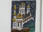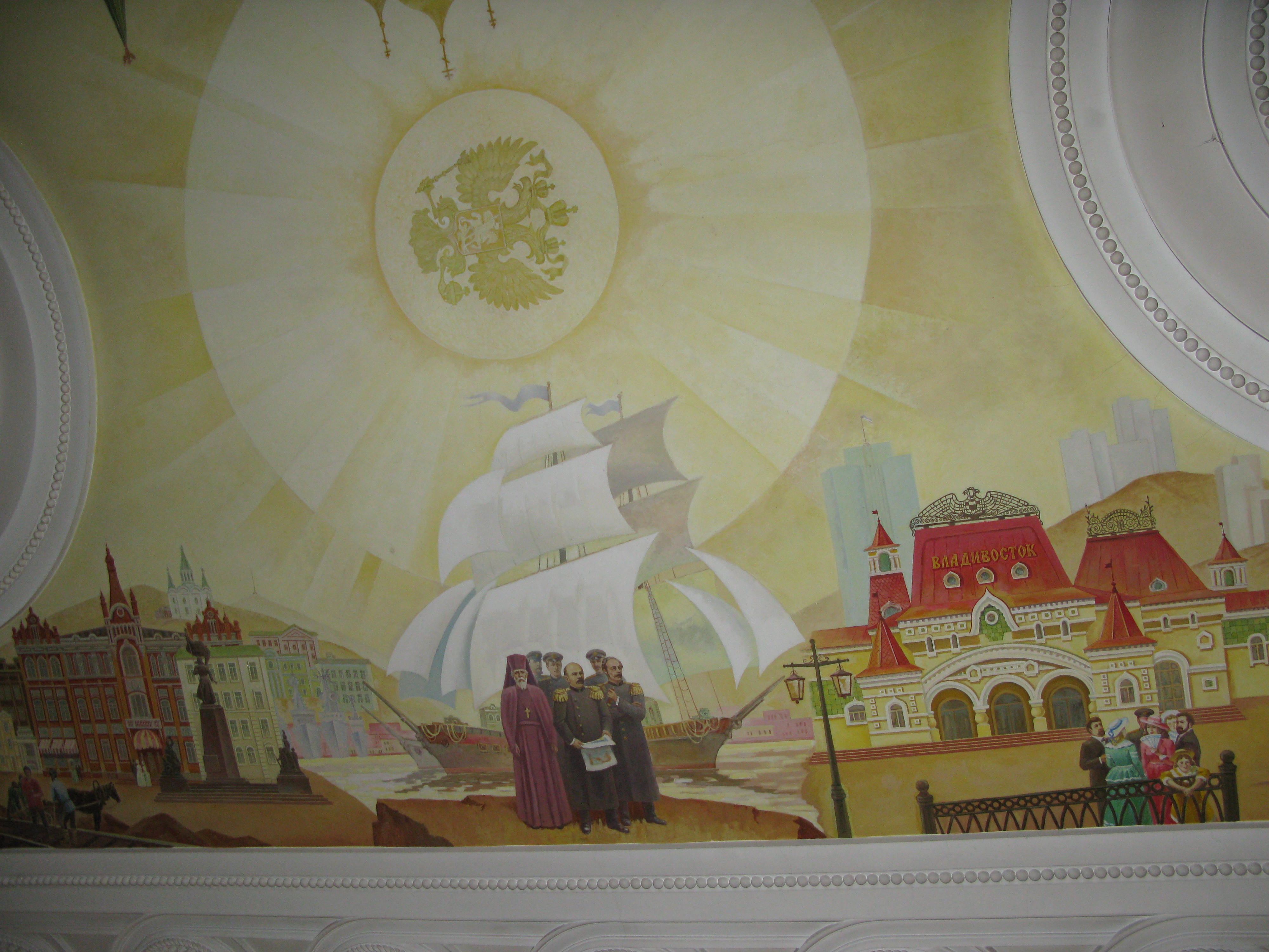 As well as a beautiful facade with lovely roof decoration and picture tiles around the edge, the entrance hall has an interesting ceiling mural (is that the right word?) depicting the building of the railway from its start in western Russia, right across the continent to the end in Vladivostok. There was actually a train setting off for Moscow when we were there. A peculiar feeling.