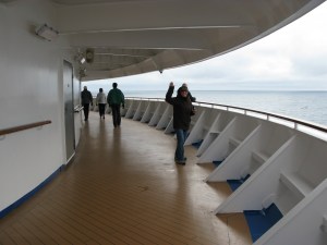 I can plug in my laptop almost anywhere – especially in the Skywalker Nightclub which tends to be sadly attended by the younger Ozbus crowd, vainly looking for new young people to drink and dance with. Sadly none forthcoming. With like-minded friends I have played two games from the library collection; I have been in the swimming pool and the hot tub – the latter even on a foggy, windy day when my shoes nearly blew away; I have walked round deck 16 several times but round deck 7 not quite. I will accomplish that before the end of the trip – following literally in Pat C’s footsteps!