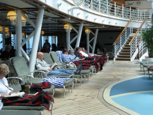 So where do I put myself? Well, I’m not in love with cruising as such. I think it’s by far the best, most comfortable and pleasant way to get from Beijing to Anchorage (failing an outright invitation to get on a motorbike with Charlie Boorman). As my good friend Linda says: ‘As a holiday destination it sucks.’ Having said that, I am not bored. I read my Kindle – currently the John Locke novels about Donovan Creed, an assassin who has me longing to change career and counteract all the good I have done in the world up to now; I have a coffee package which entitles me to 15 REAL coffees as well as free house coffee (filter) and hot chocolate whenever I want – and there’s a nice coffee lounge to relax in;