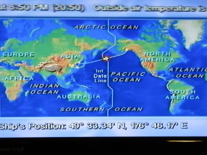 So the following day, Monday 16th (when it finally arrived) brought with it an announcement from the Bridge: we would cross the International Date Line at 13.15, but would only cross latitude 180 later in the day at about 21.00. The reason being that the IDL does not do straight lines, but veers off at angles to include neighbouring islands who don’t want to be a day apart.