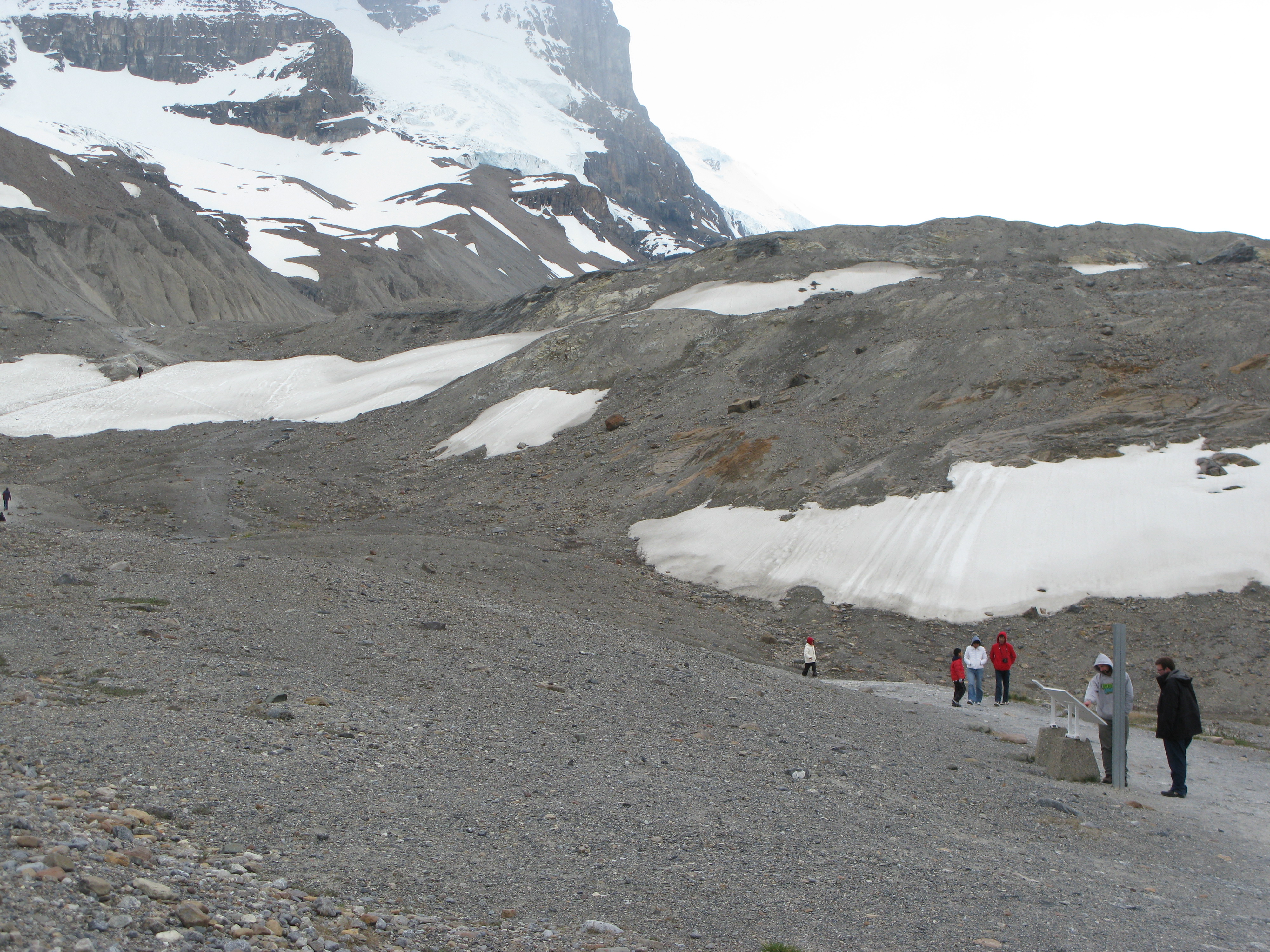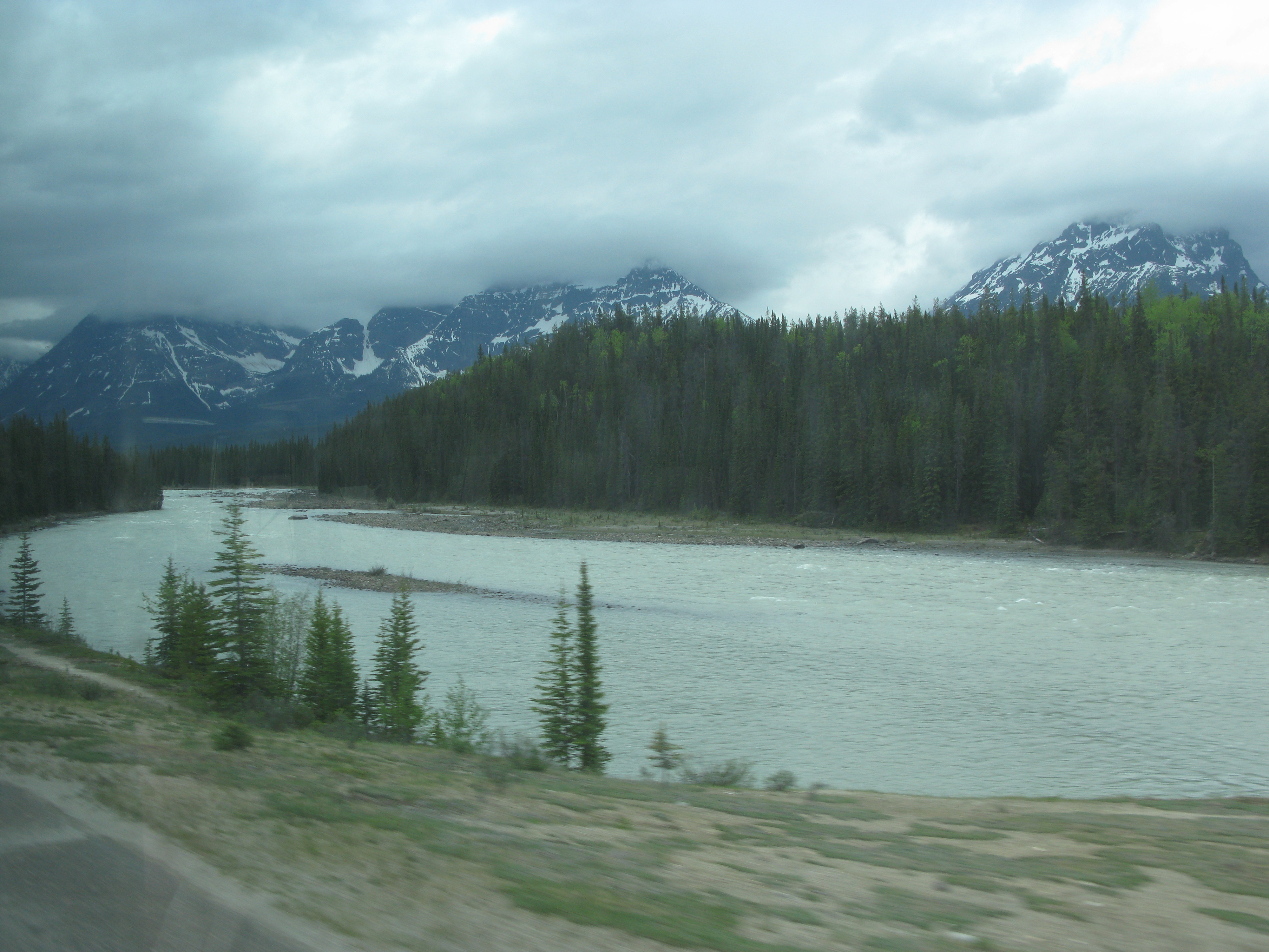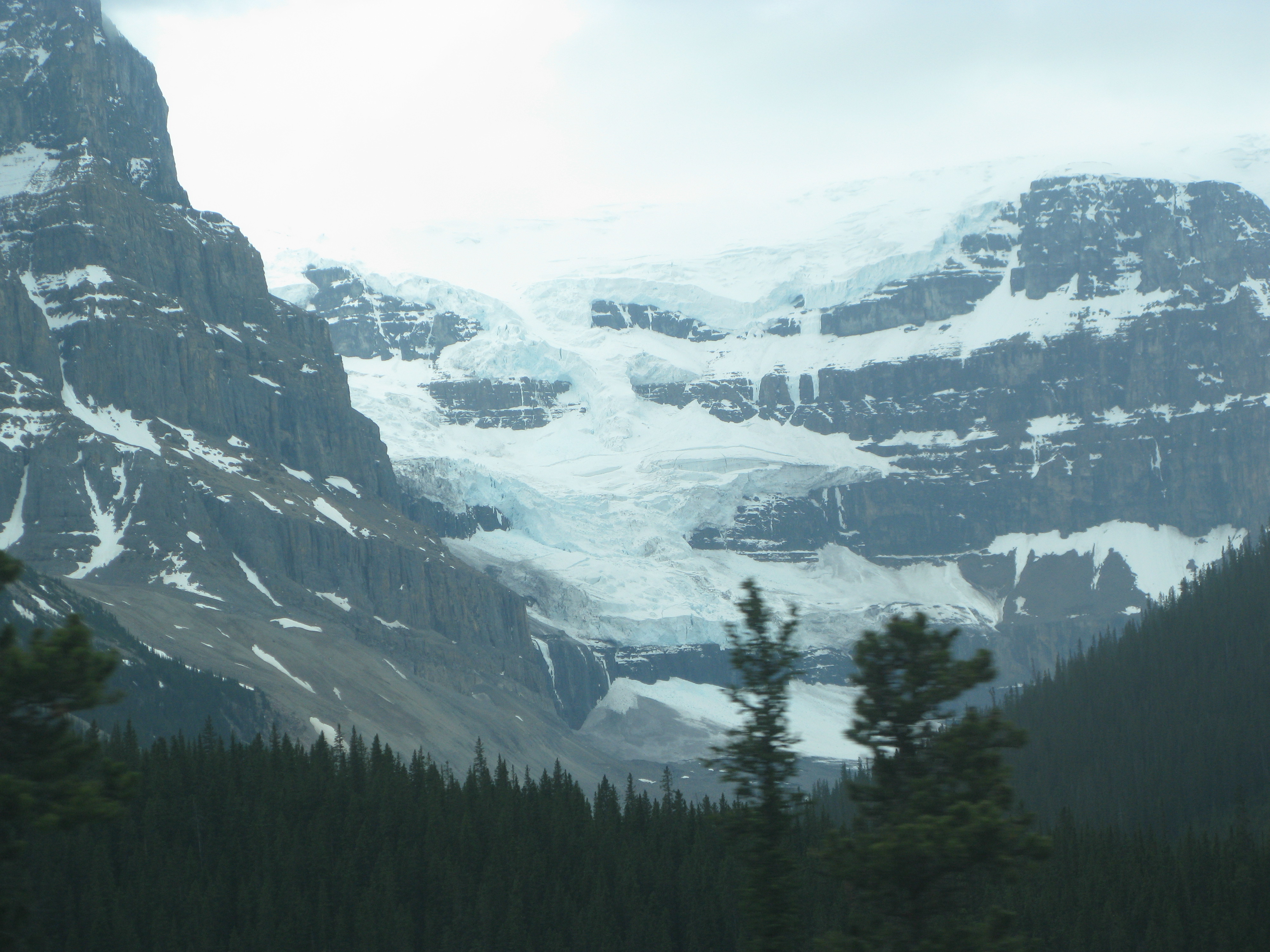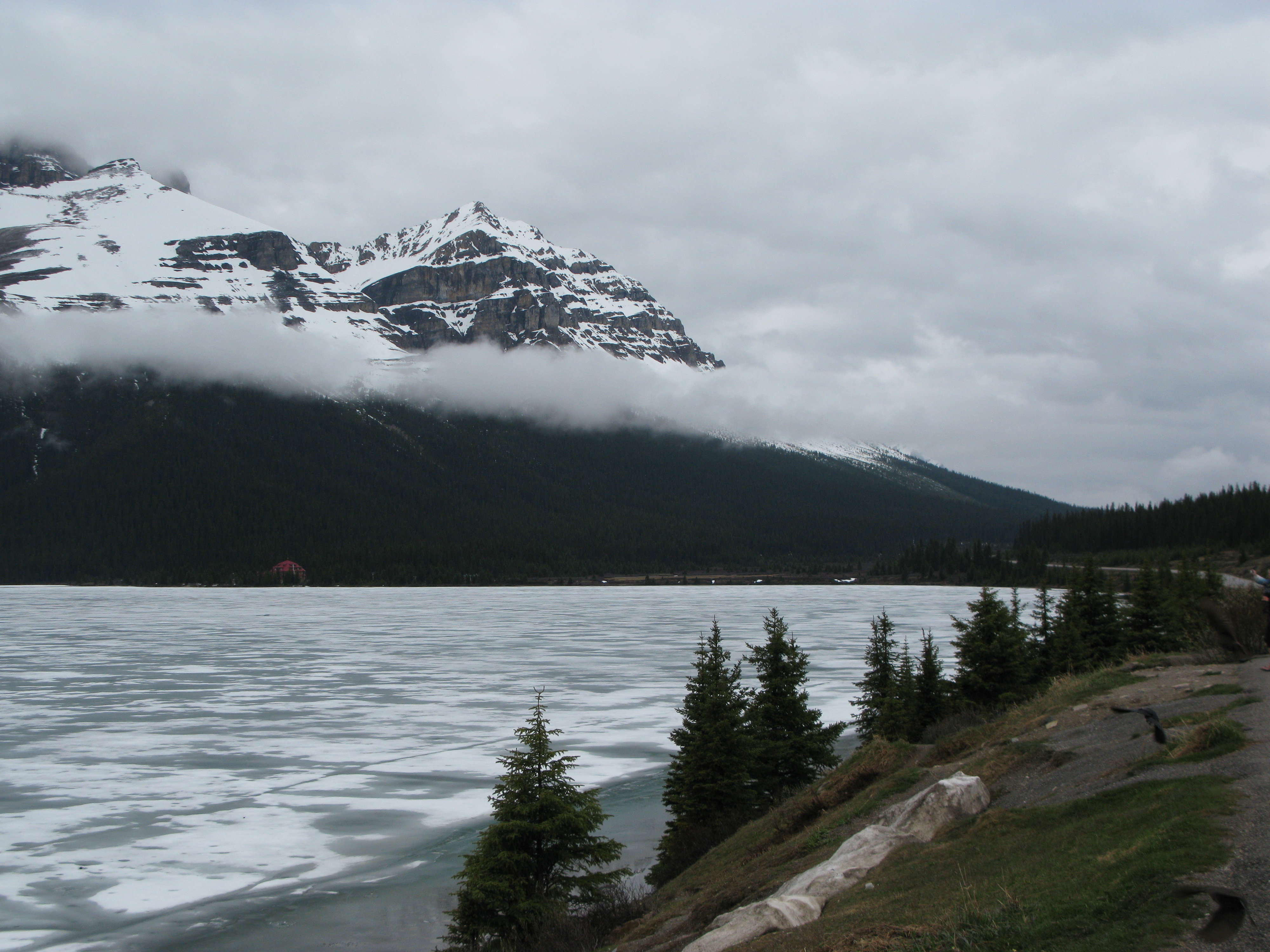 Leaving Banff after a night on the bus (parked in a campsite) and lovely showers and breakfast, we headed for Lake Louise. A beautiful spot and so well documented by all those who have been there, so I won’t elaborate. Just to say that there was mist on the mountains, and the floating ice on the lake made it quite ethereal and mystical. There were very few people there; some girls threw stones on to the ice – and we followed suit – in order to see the spears of ice, six to eight inches long, attached vertically to each other to form the ice sheet, float off horizontally in a fan shape like miniature icy logs in the water.
