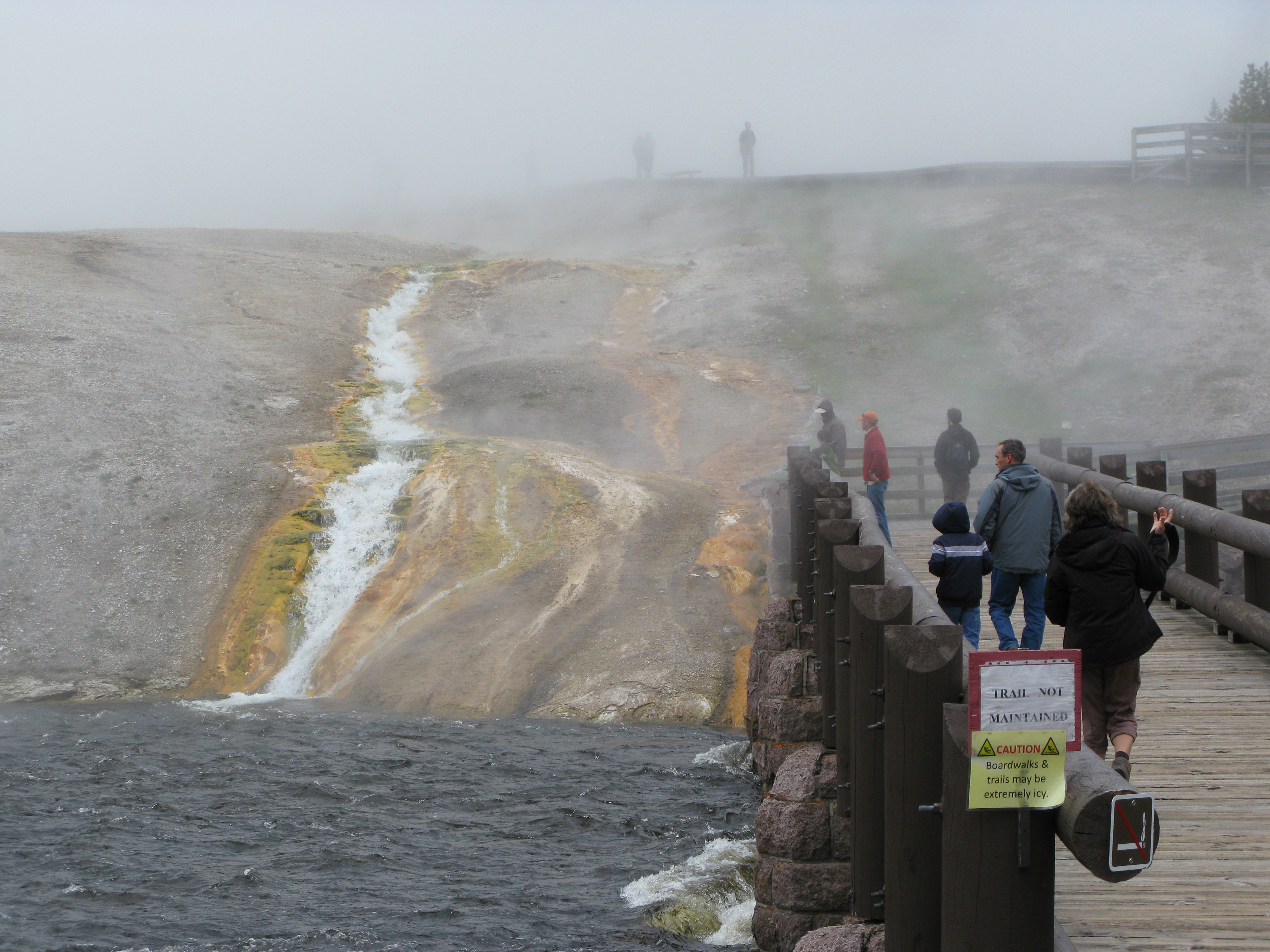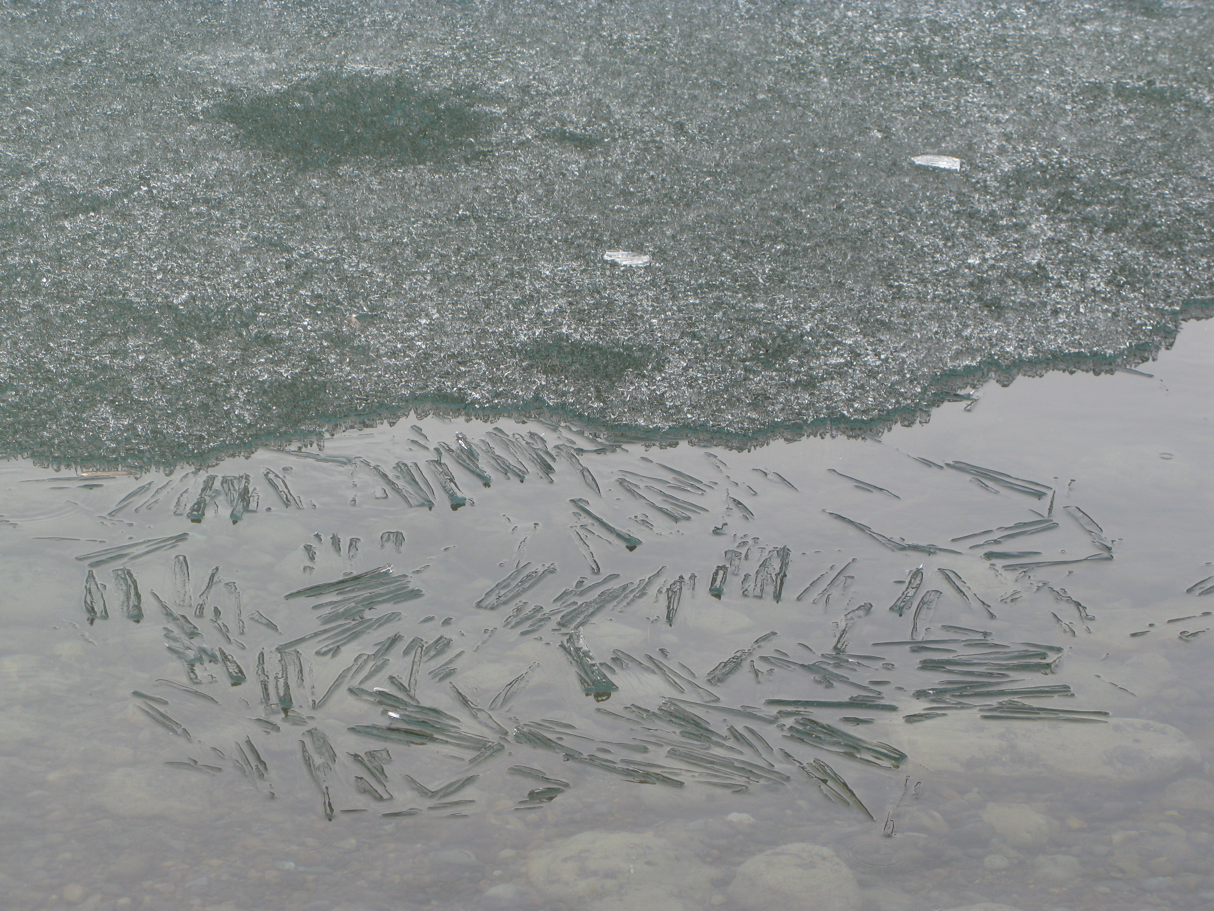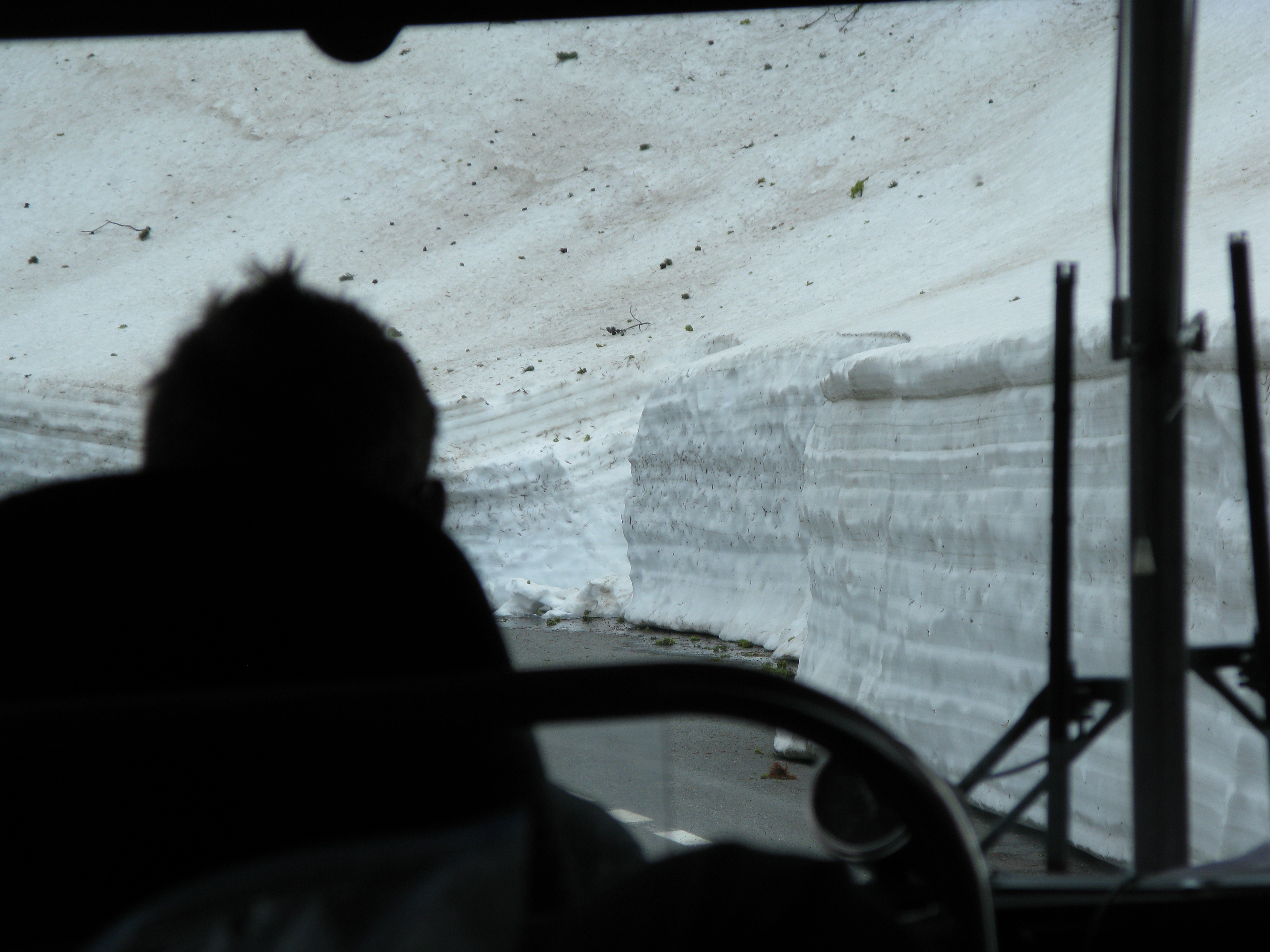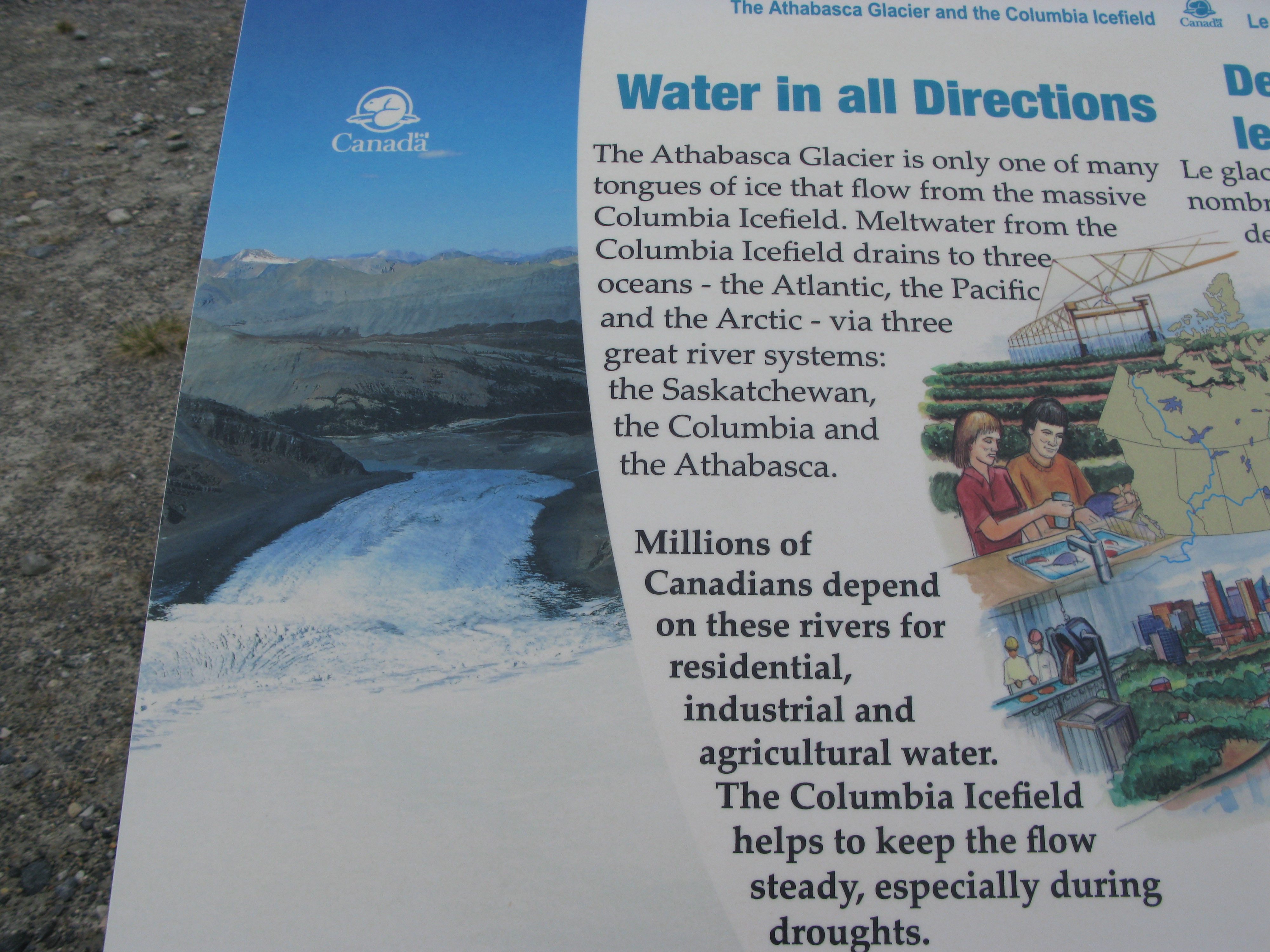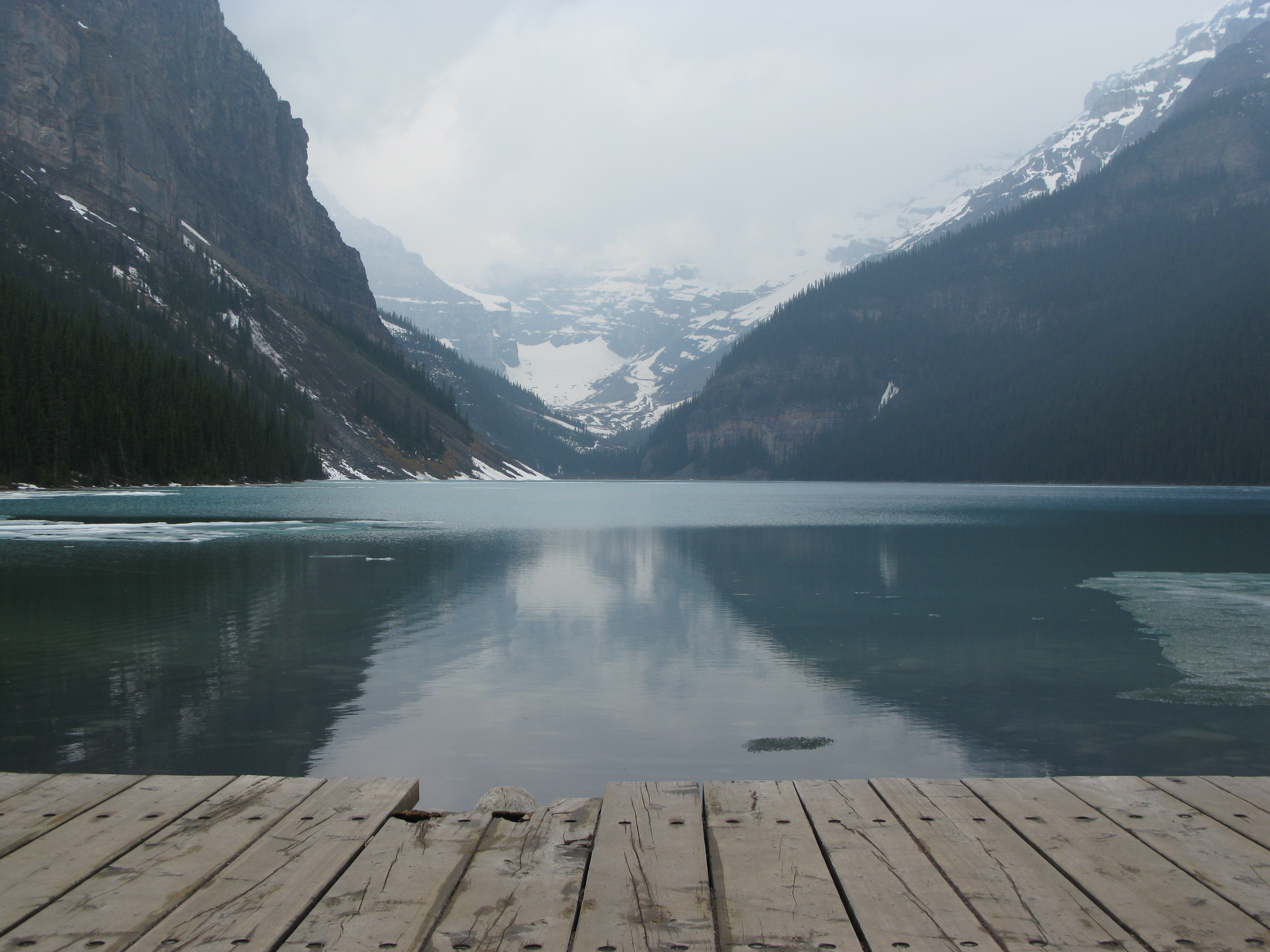 Leaving Banff after a night on the bus (parked in a campsite) and lovely showers and breakfast, we headed for Lake Louise. A beautiful spot and so well documented by all those who have been there, so I won’t elaborate. Just to say that there was mist on the mountains, and the floating ice on the lake made it quite ethereal and mystical. There were very few people there; some girls threw stones on to the ice – and we followed suit – in order to see the spears of ice, six to eight inches long, attached vertically to each other to form the ice sheet, float off horizontally in a fan shape like miniature icy logs in the water.