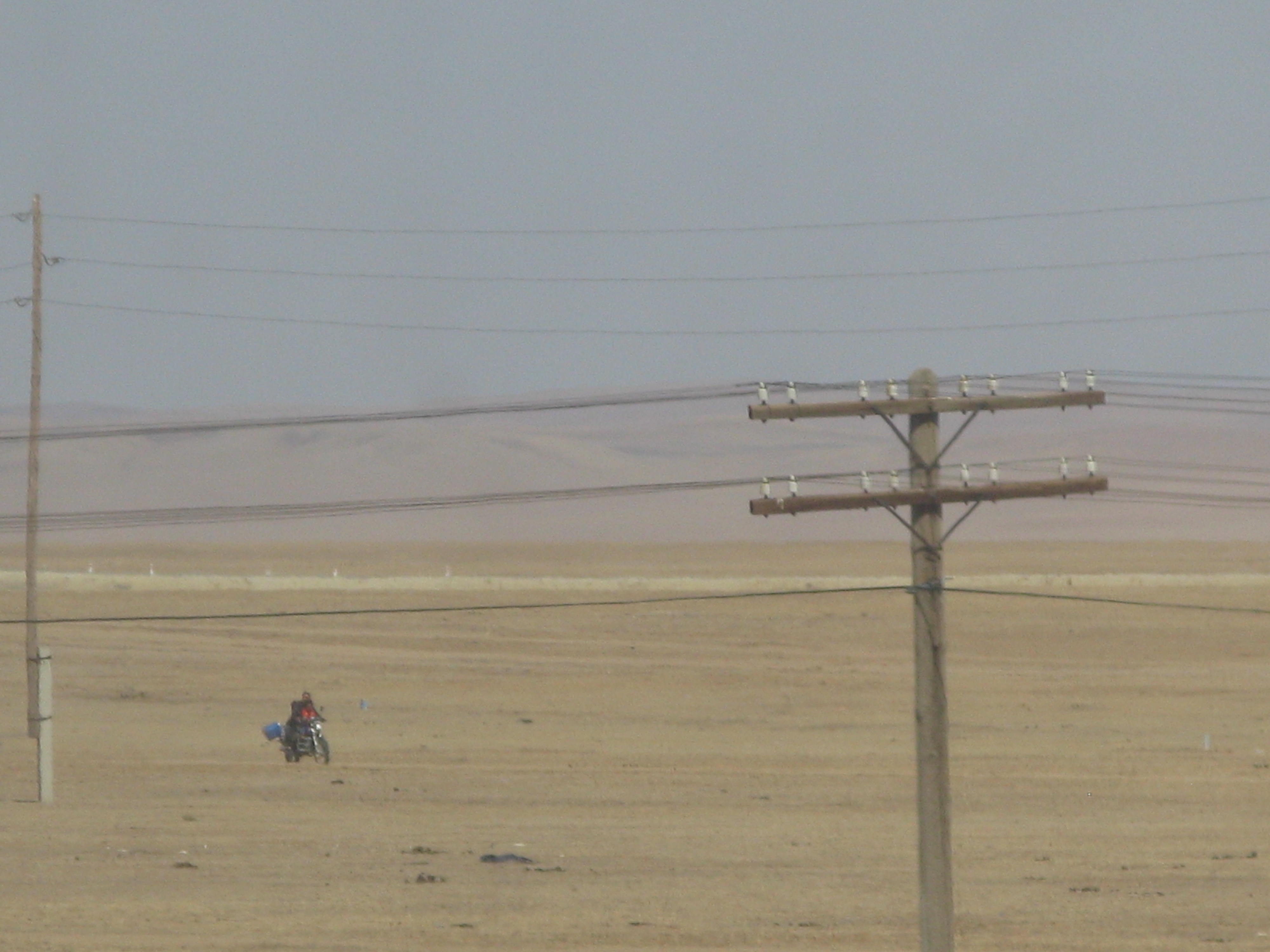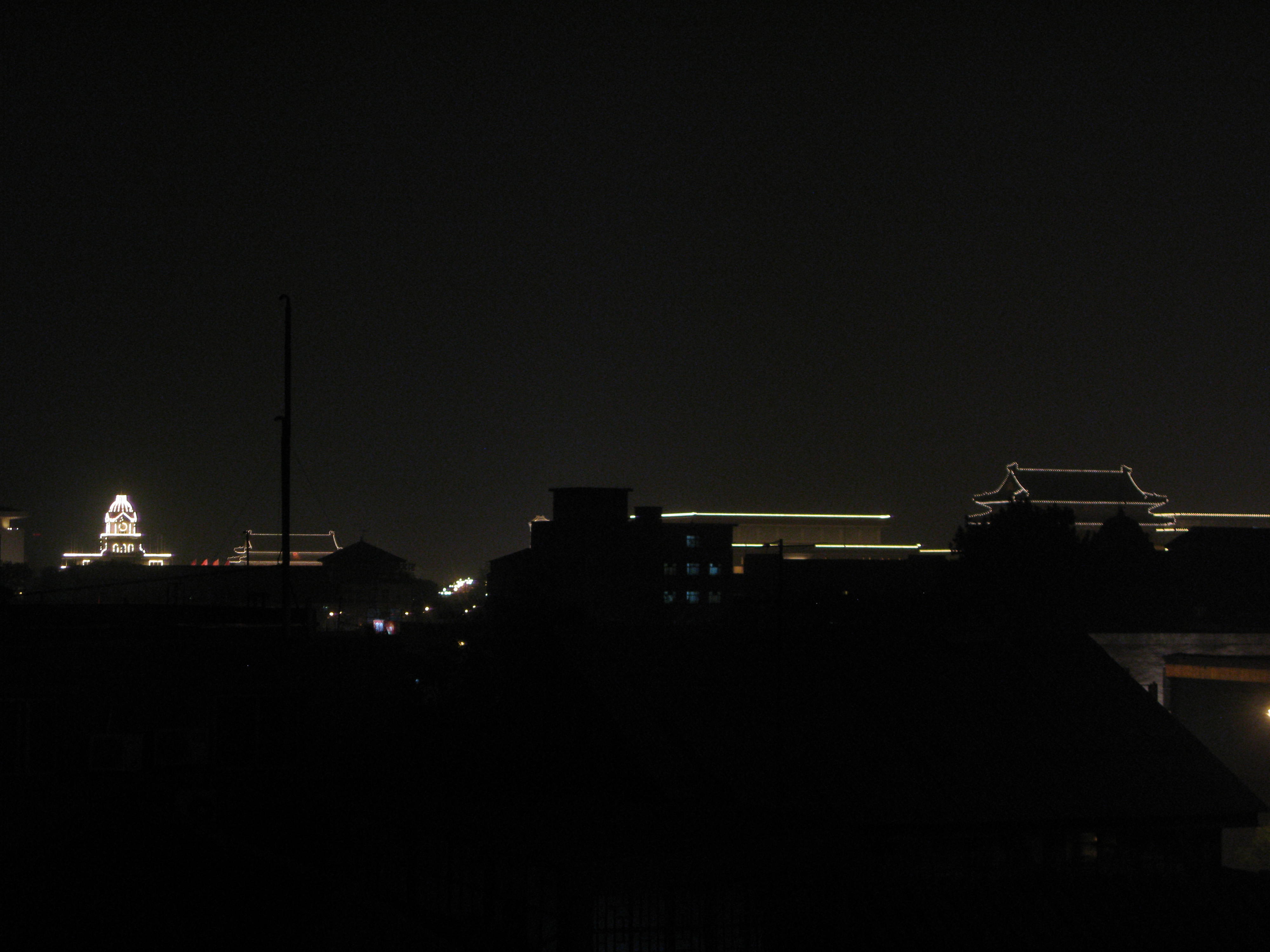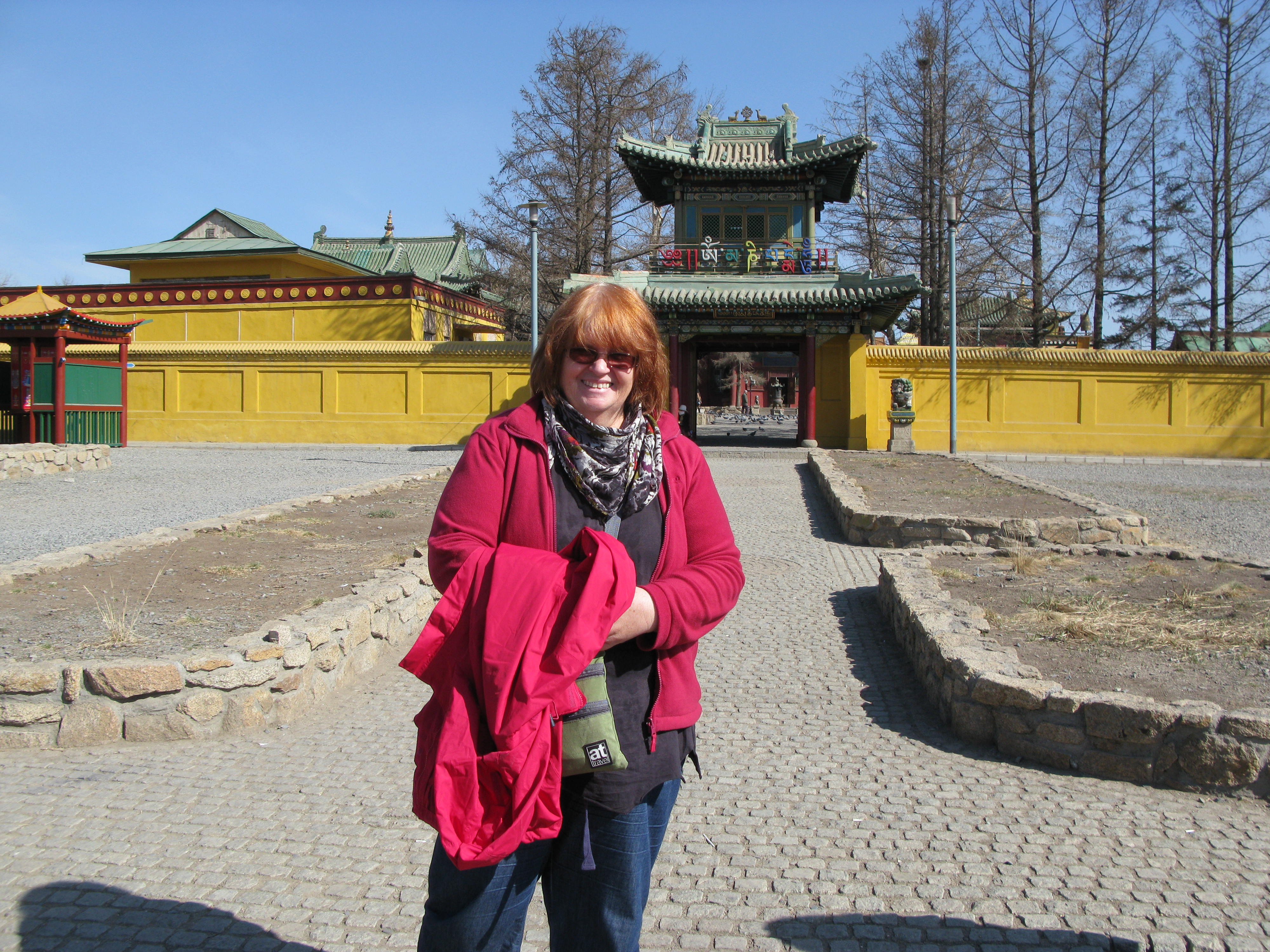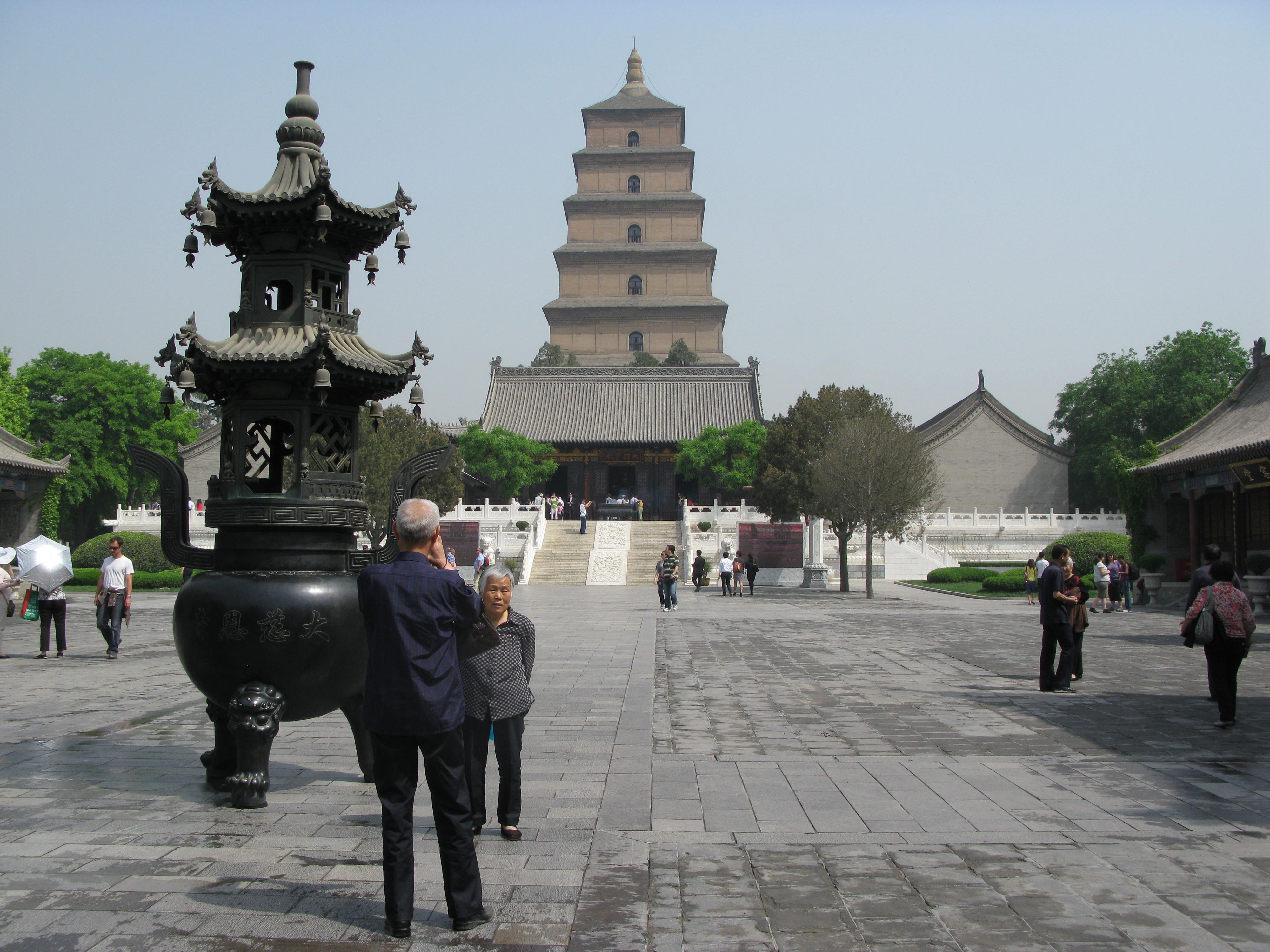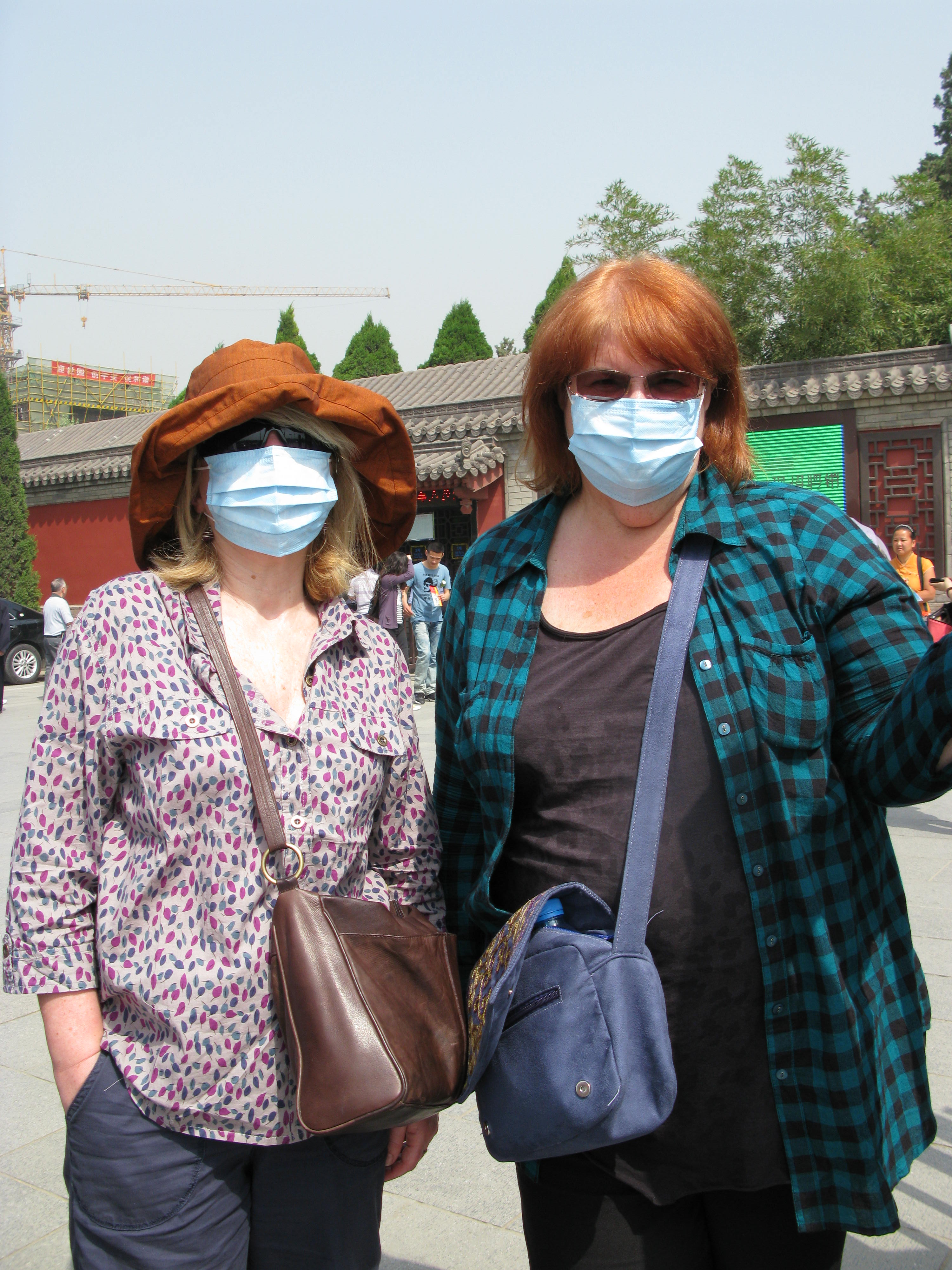 The room was pleasant – twin beds – apart from that I found Xian quite a challenge. The sand that was blowing over north China from the Gobi Desert was the major problem, together with Xian’s natural smog, caused partly by car exhausts but also from wood and coal stoves all over the city. Just like Victorian London. When we went out, Gary bought dust masks for Caroline and me and we wore them through the Wild Goose Pagoda visit. A most attractive look! (Sorry – can’t get the photo to stay rotated…!) Xian is the capital of Shaanxi province, and Shaanxi is part of the Loess Plateau which is covered by microscopic silt that began blowing down from Siberia during the last Ice Age. This makes is a very dusty place – you can see it all just hanging in the air. Couldn’t even open the bedroom windows, so had air-con on all day and night.